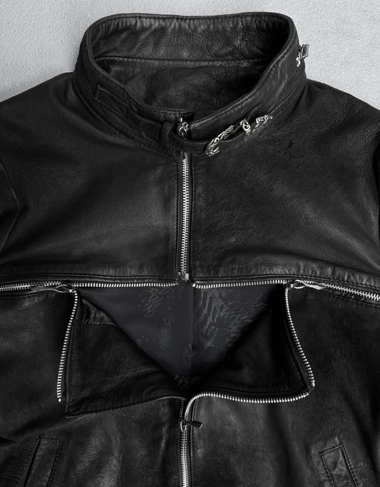 14thAddiction AW17 Distressed Sheepskin Leather Cross-zip Jacket