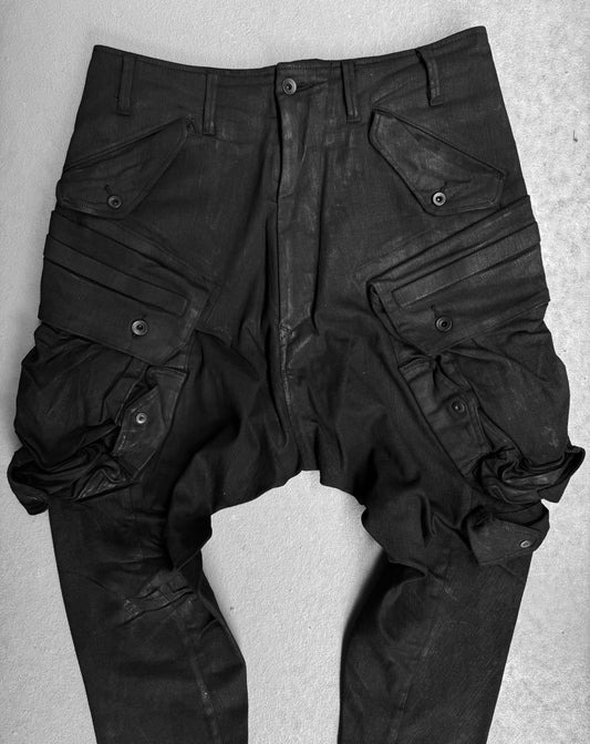 Julius_7 AW20-21 “DUKKHA;” Waxed Denim Gas-Mask Cargo Pants