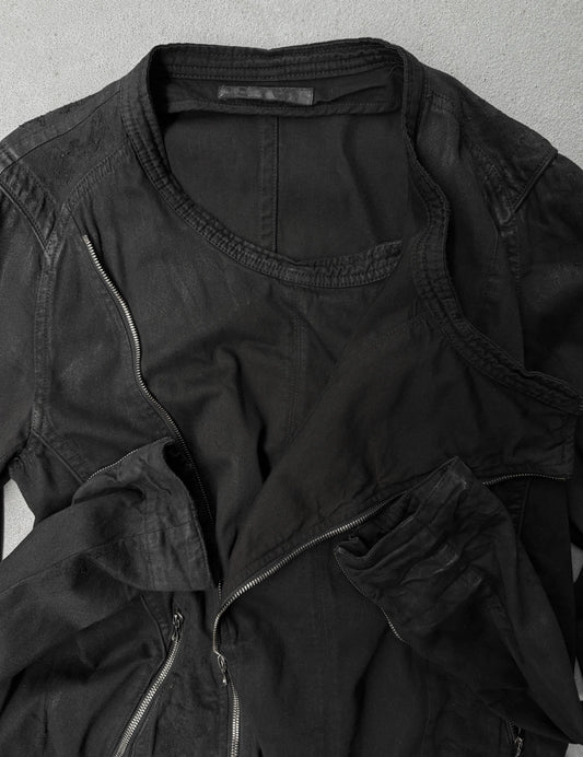 Julius_7 SS11 "Chaos ; Ontological Anarchism" Asymmetrical Zip Distressed Waxed 8oz Denim Rider Jacket