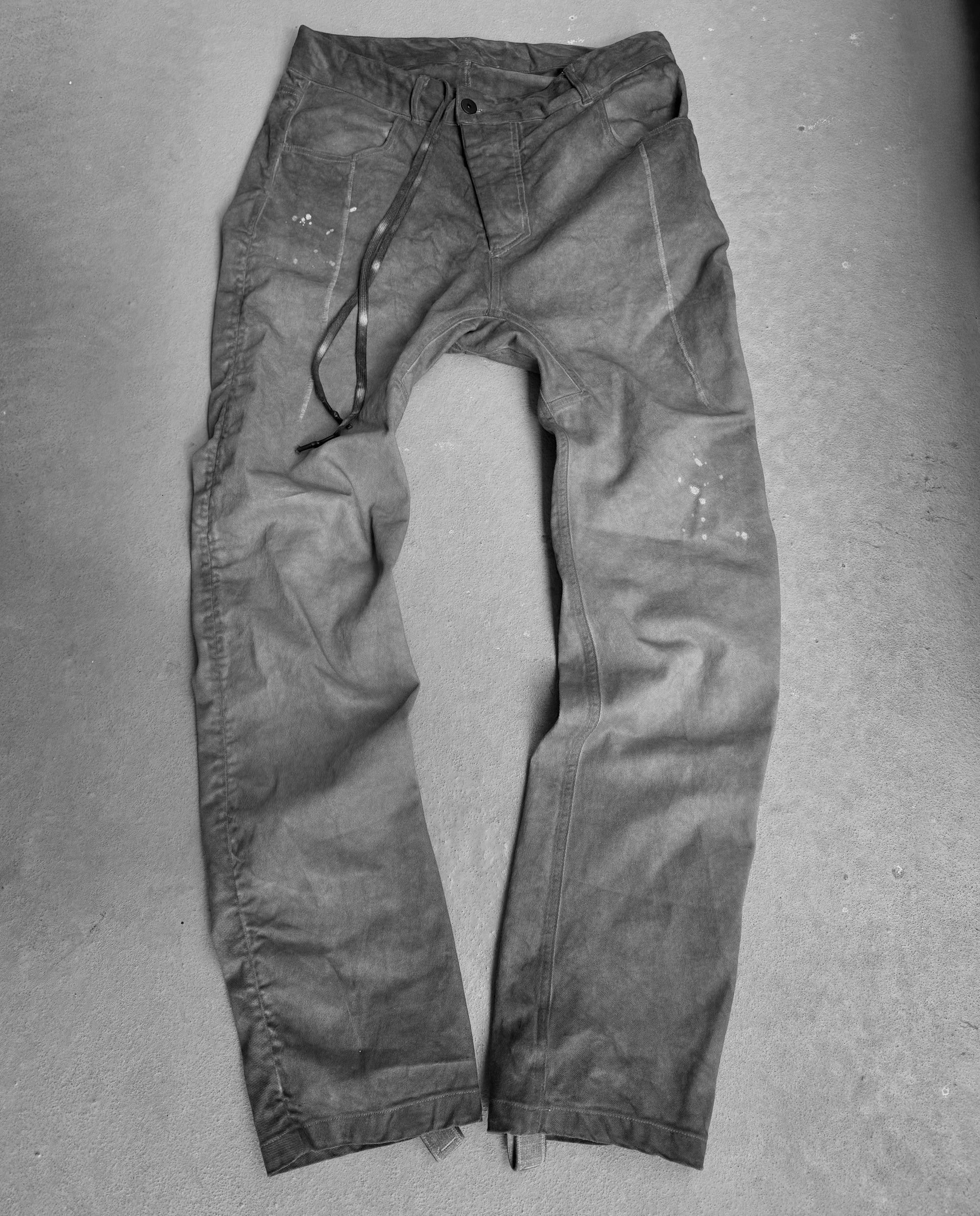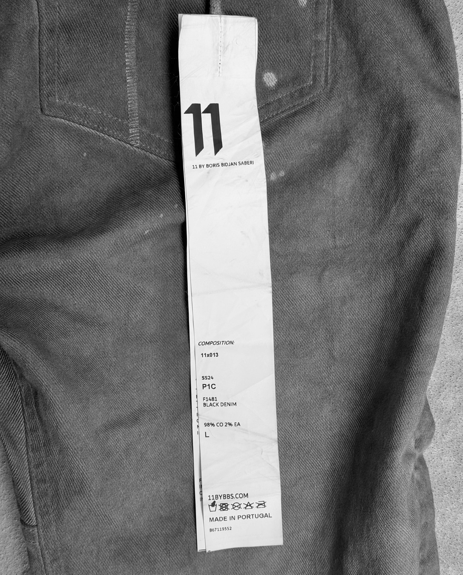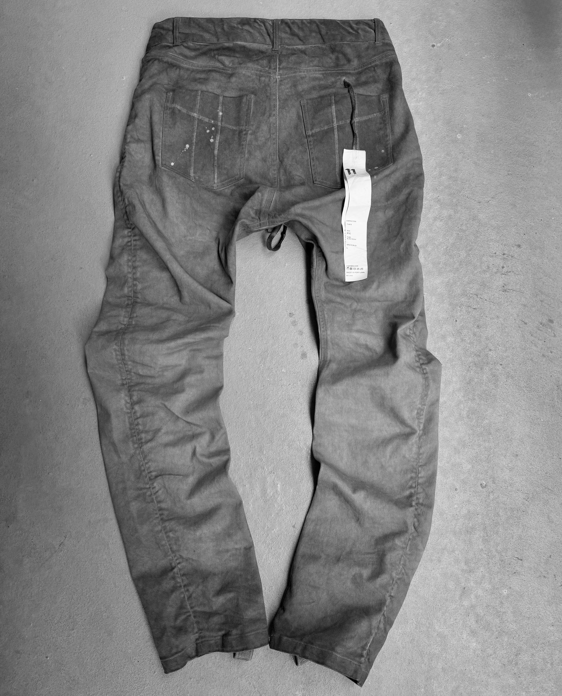 Boris Bidjan Saberi, a half German, half Persian menswear designer born on September 11, 1978, in Munich, Germany, merges dual traditions and a passion for numerology into his avant-garde creations. His eponymous label, launched in 2007, finds inspiration in his complex philosophy, with Monistrol de Montserrat and Barcelona serving as spiritual atelier locations. Drawing from the genetic legacy of Boris Bidjan Saberi, 11 emerges with a distinct identity, showcasing silhouettes crafted through intricate pattern work. These hidden drawstring denim jeans feature a subtle grey gradient effect throughout. The long inseam will allow the jeans to have a "stacked" look on the wearers legs.