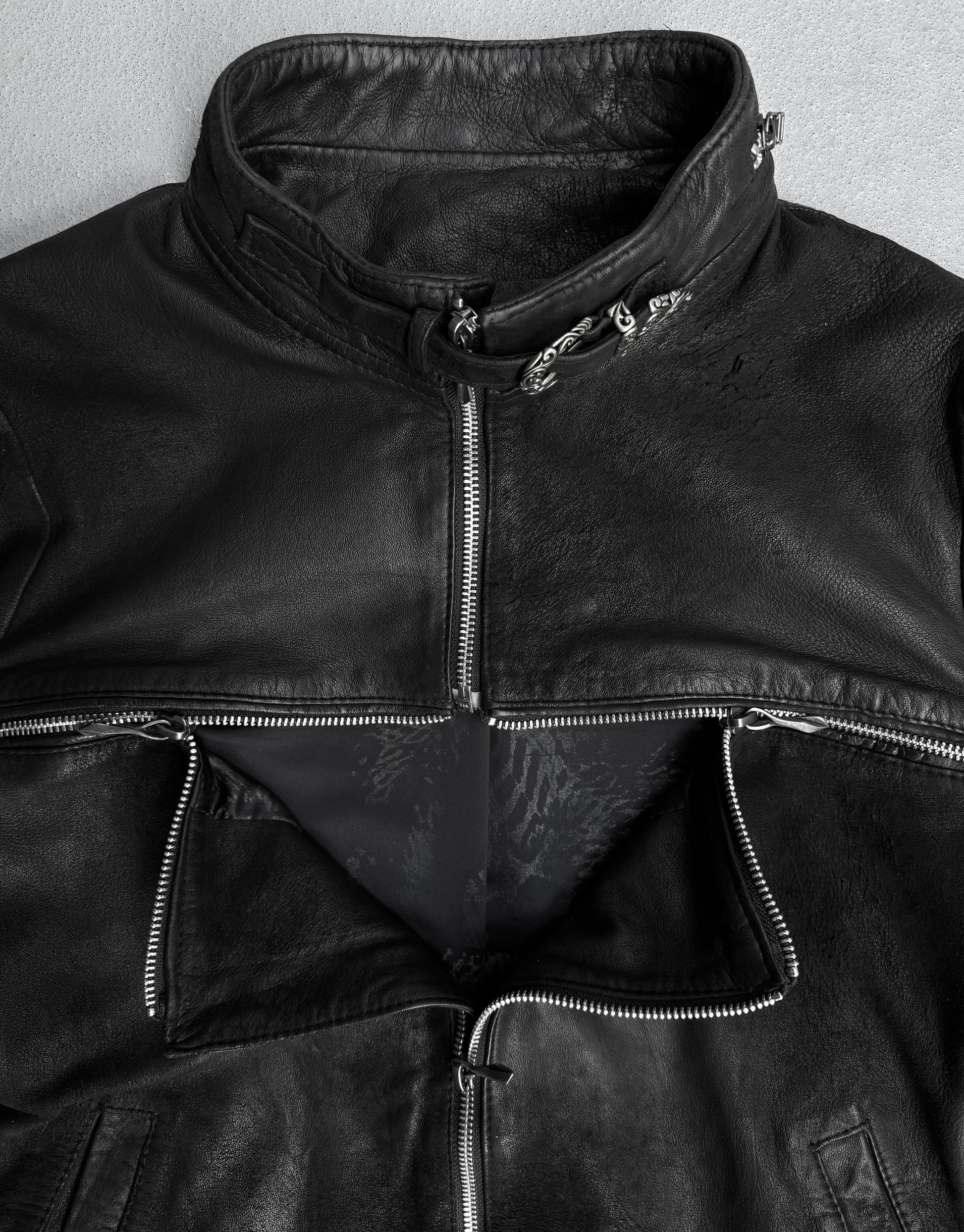 This distinctive ‘cross-zip’ leather jacket is the original version before mass-production in 2024, this silhouette has garnered a dedicated following among fashion enthusiasts seeking unique, handcrafted pieces that challenge conventional design norms.