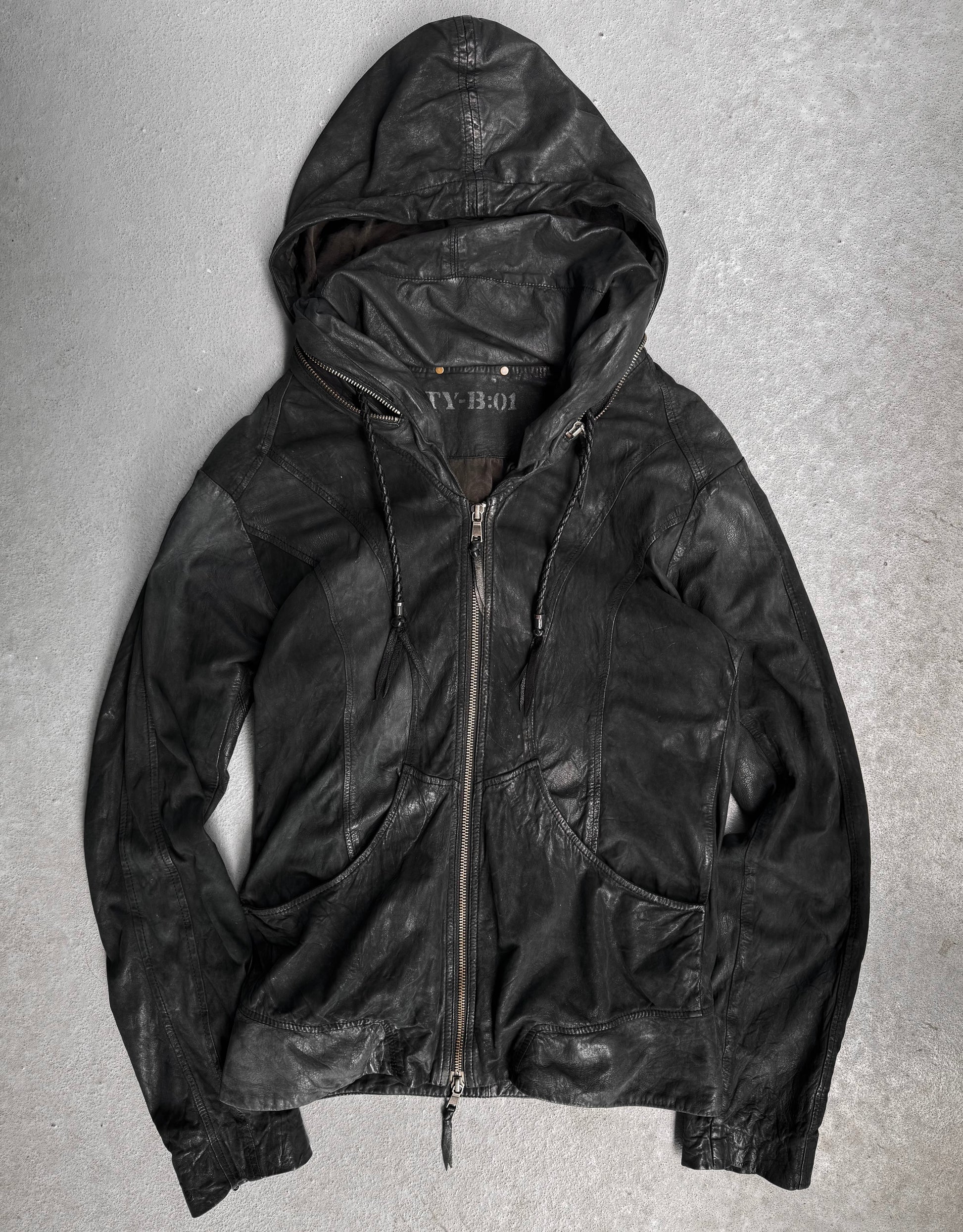 Showcasing a jacket from the elusive label, crafted entirely out of treated sheepskin suede leather with 100% silk lining, featuring a convertible hood collar and unique military-inspired hardware throughout.