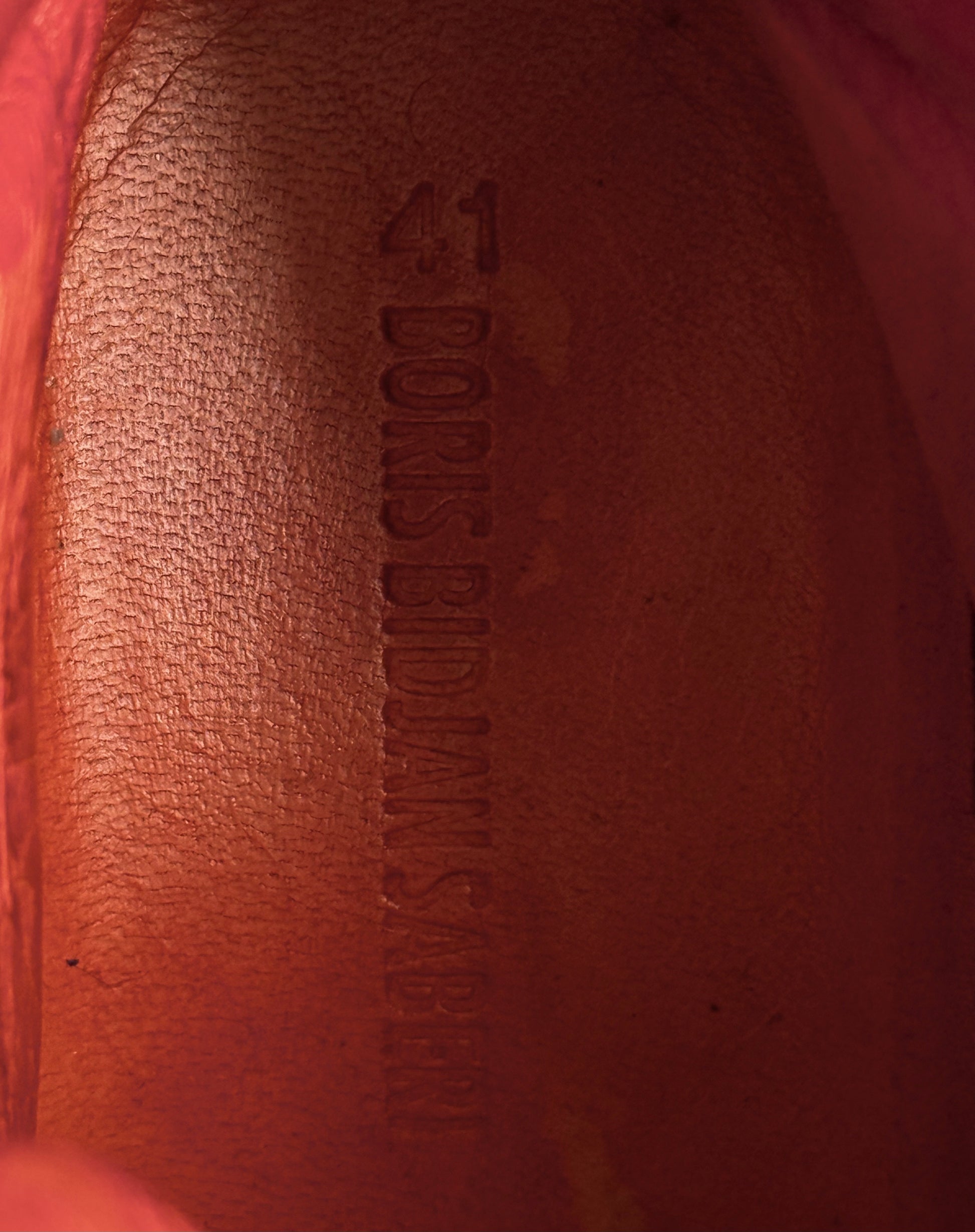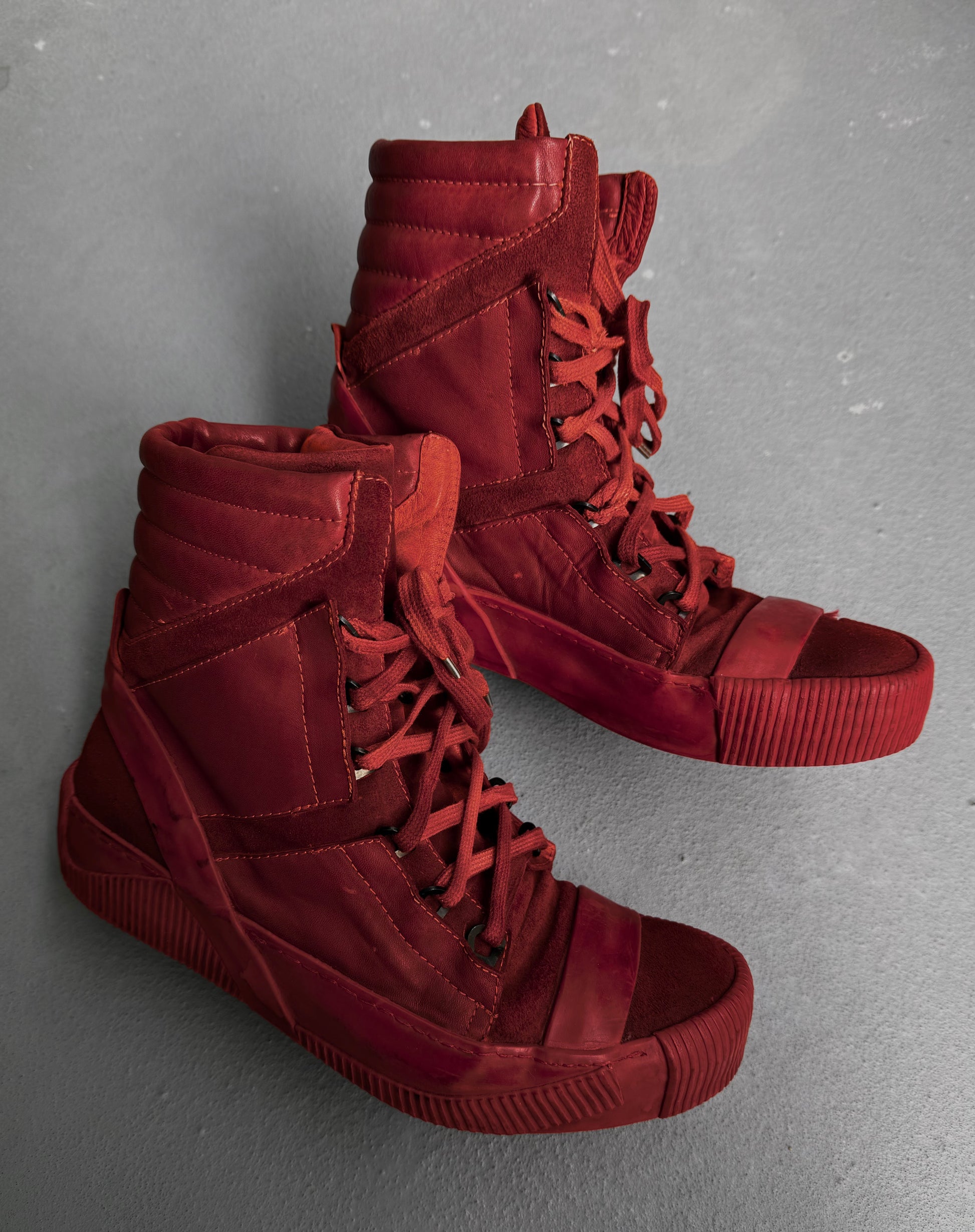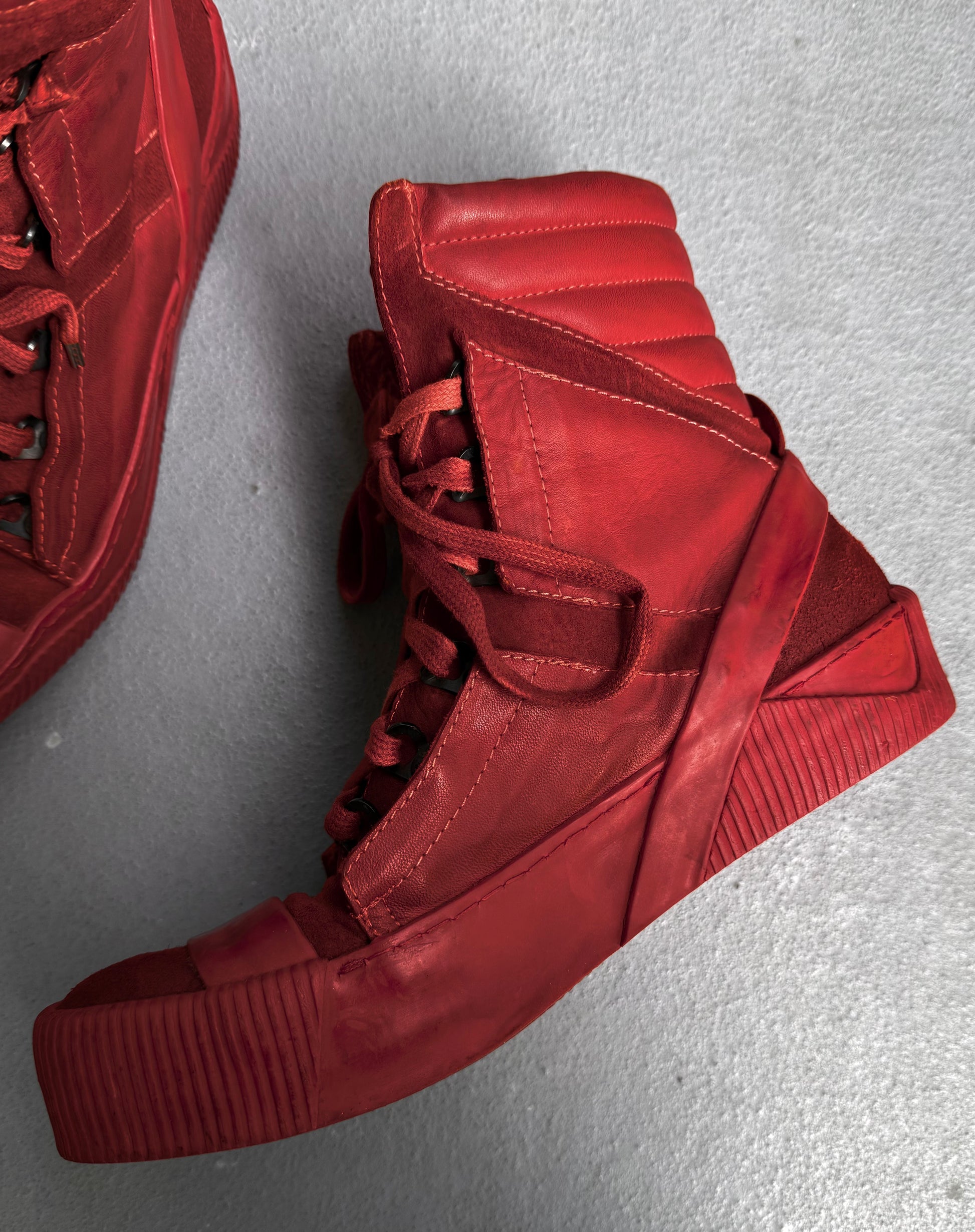 No longer in production, these bold red high-top sneakers are crafted from lamb leather, showcasing a durable construction that highlights the full-grain and reverse side of the leather throughout. Comes with removable insoles.