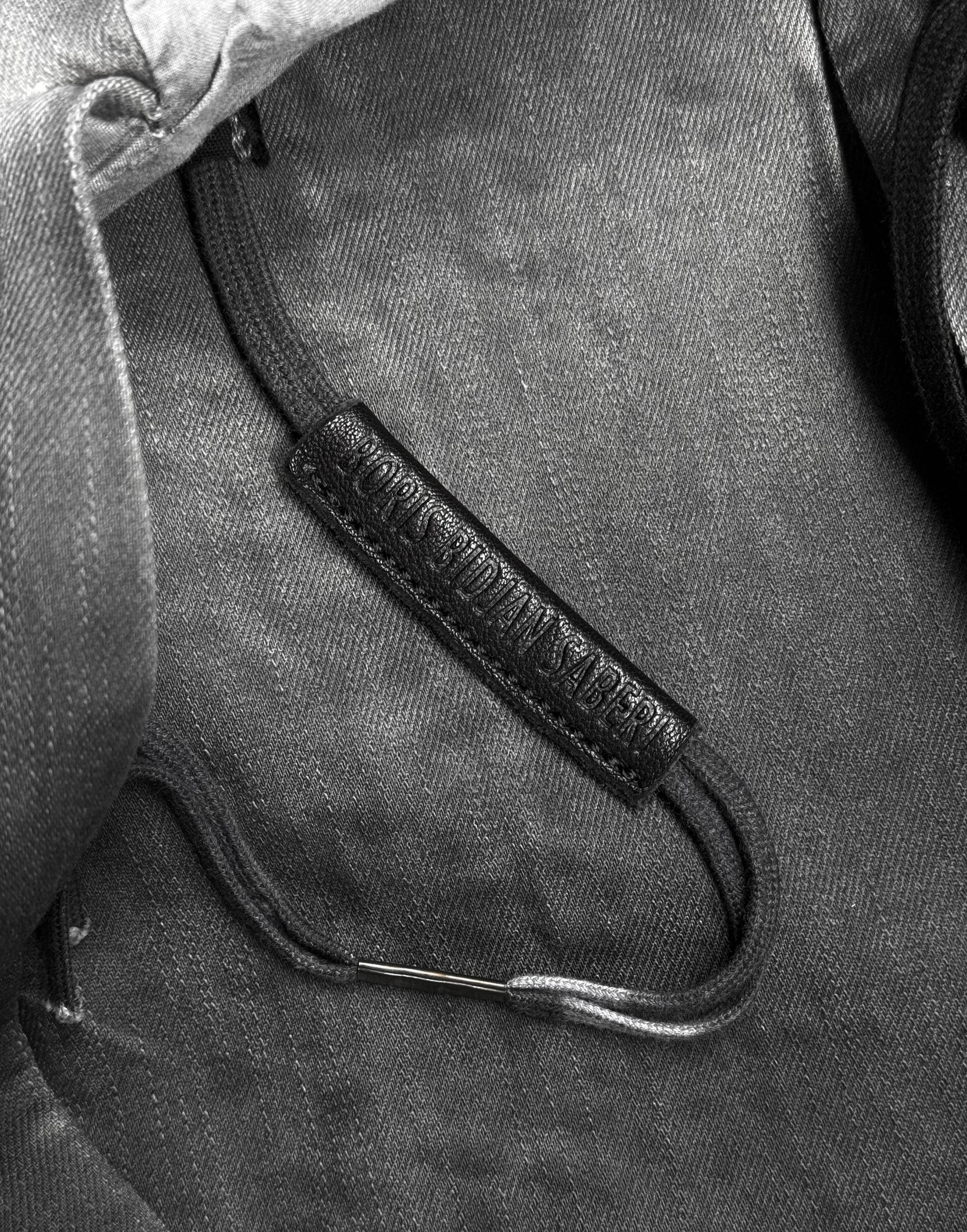 Boris Bidjan Saberi, a half German, half Persian menswear designer born on September 11, 1978, in Munich, Germany, merges dual traditions and a passion for numerology into his avant-garde creations. His eponymous label, launched in 2007, finds inspiration in his complex philosophy, with Monistrol de Montserrat and Barcelona serving as spiritual atelier locations. This particular blazer was showcased on the avant-garde label’s Spring/Summer 2012 runway collection, an updated version of the classic ‘SUIT3’ with an elongated flap at back in a cold-dyed dark grey, the blazer feature leather buttons throughout and shoulder pads that enhance the sharpness of the fit.