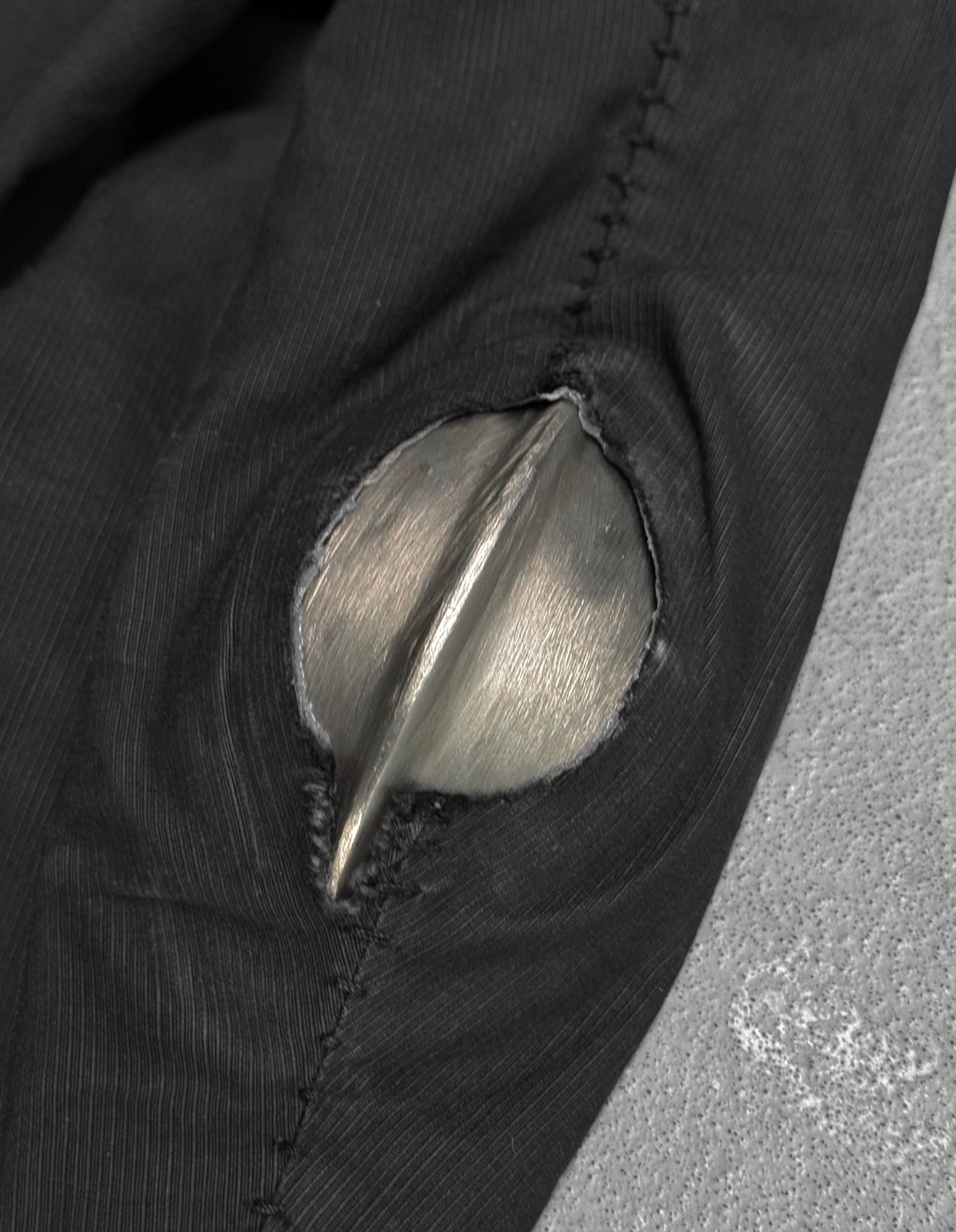 Missing inner chest left pocket button, cracked & chipped front button, fabric wear by the left titanium elbow, tape seam peeling throughout (does not compromise jacket construction), general fabric wear & fading throughout