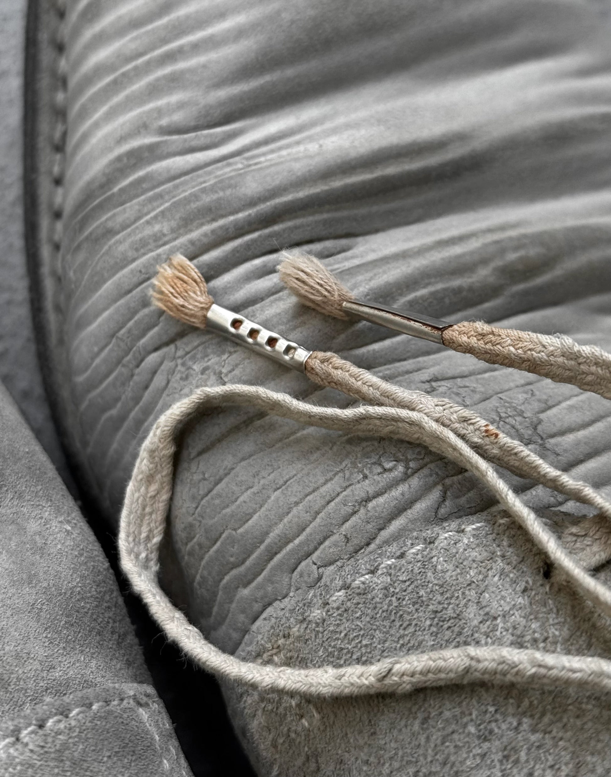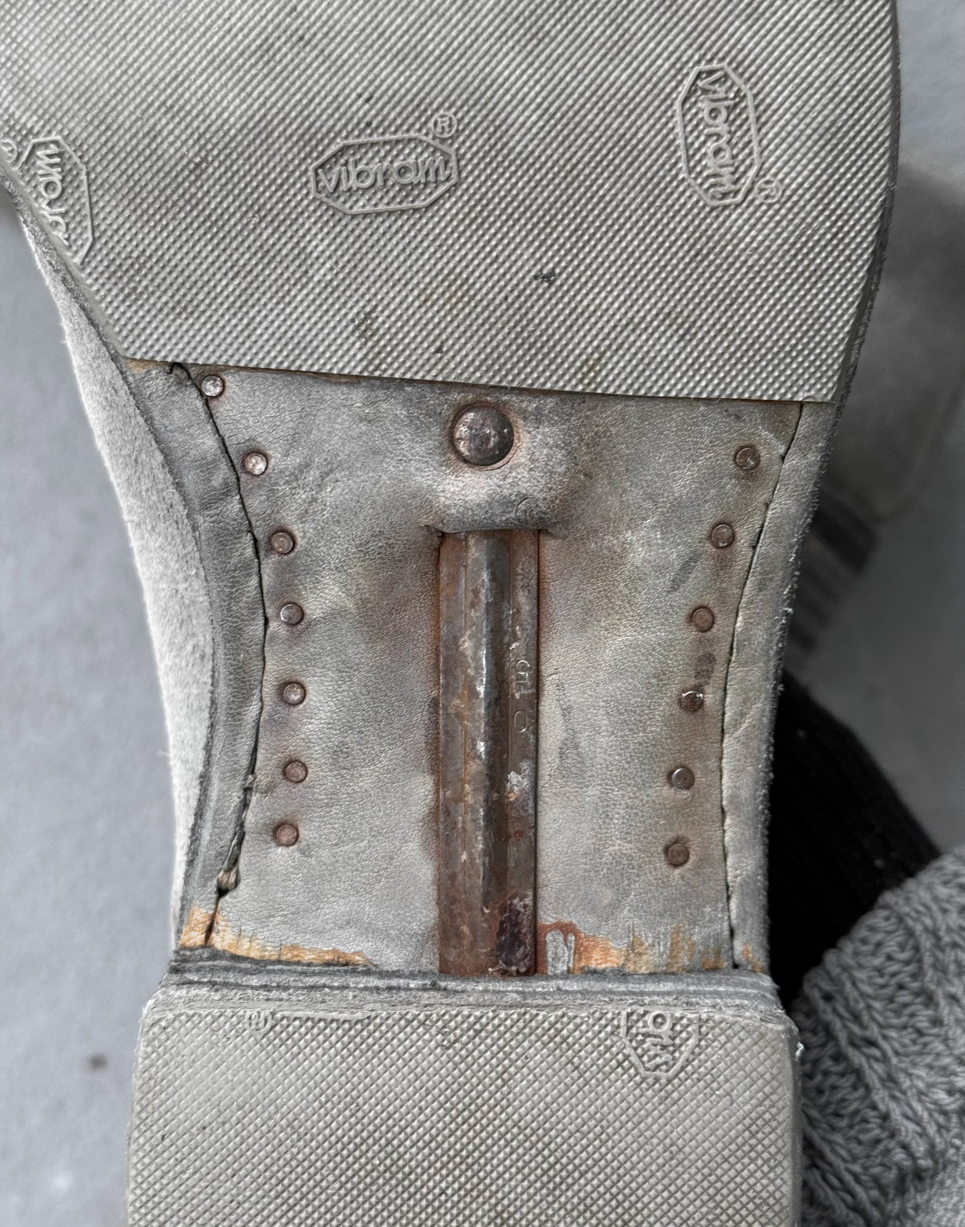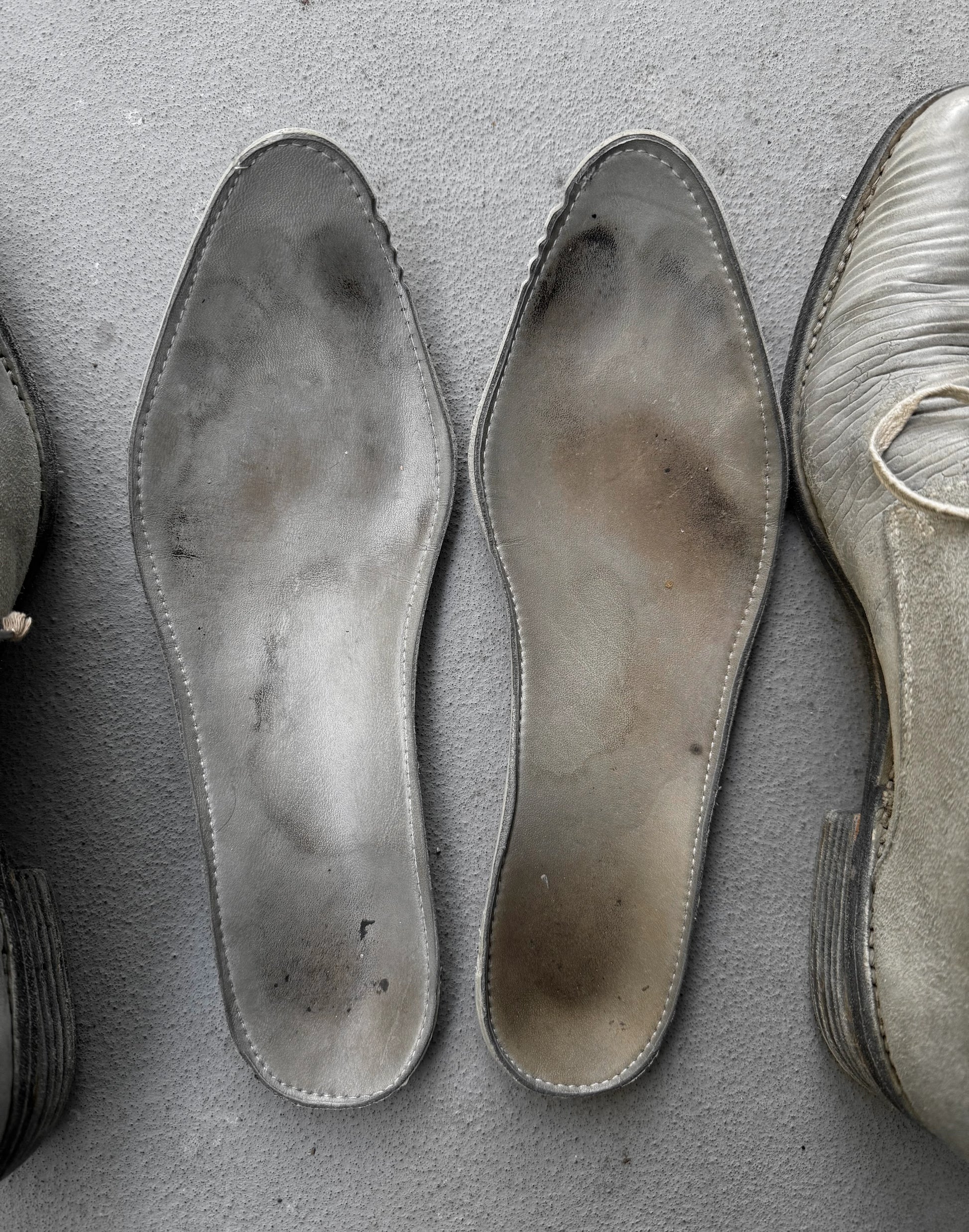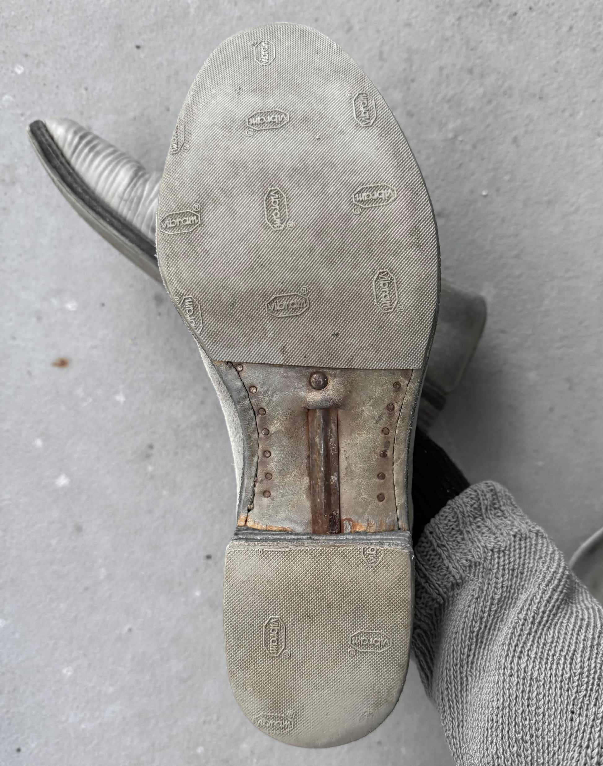 Small loose stitch at the back of left derby, minor heel counter lining peel on the right derby, light wear throughout, minor heel drag, rubber Vibram half sole & heel installed, comes with original insole, used rice bag & tag