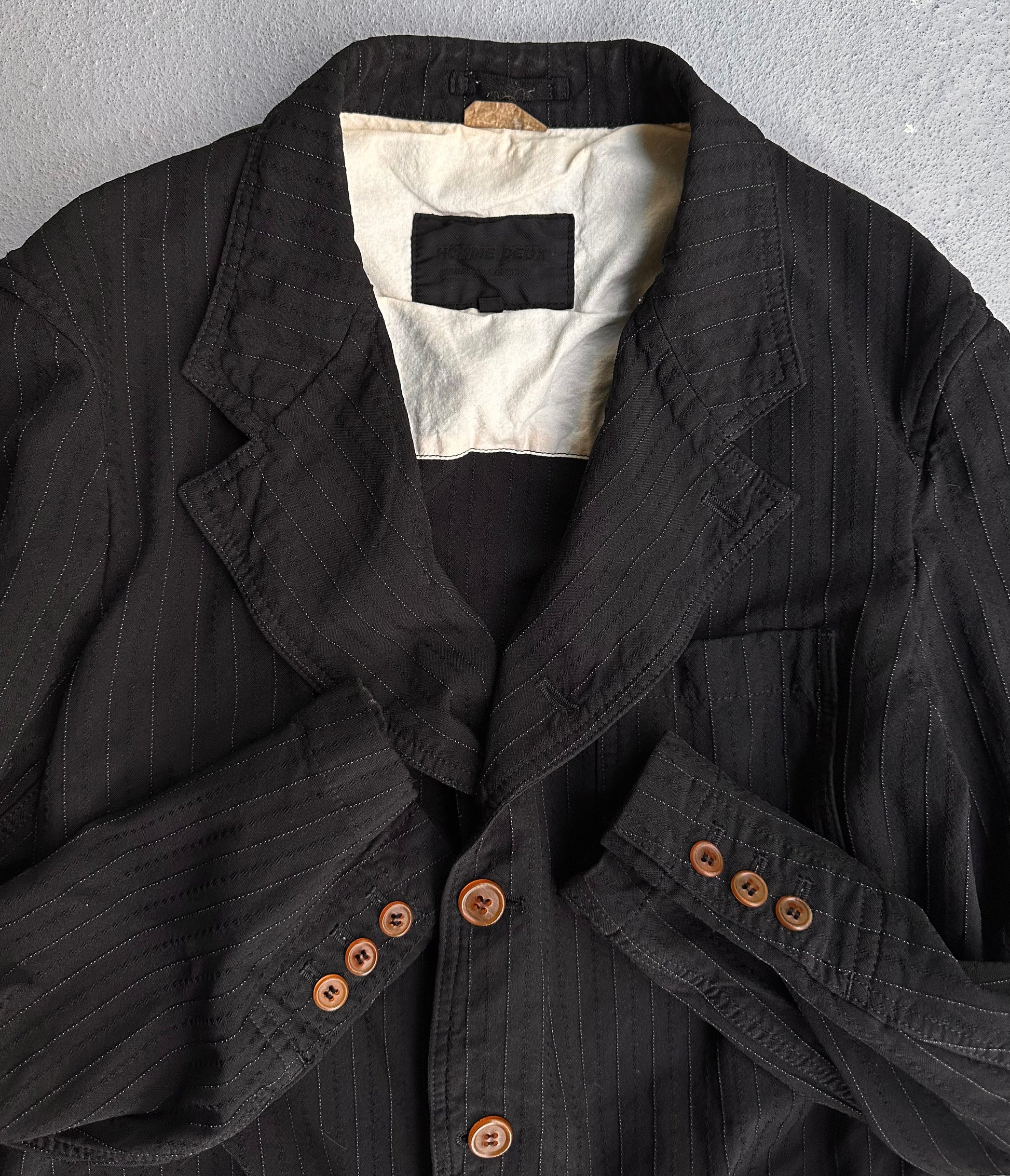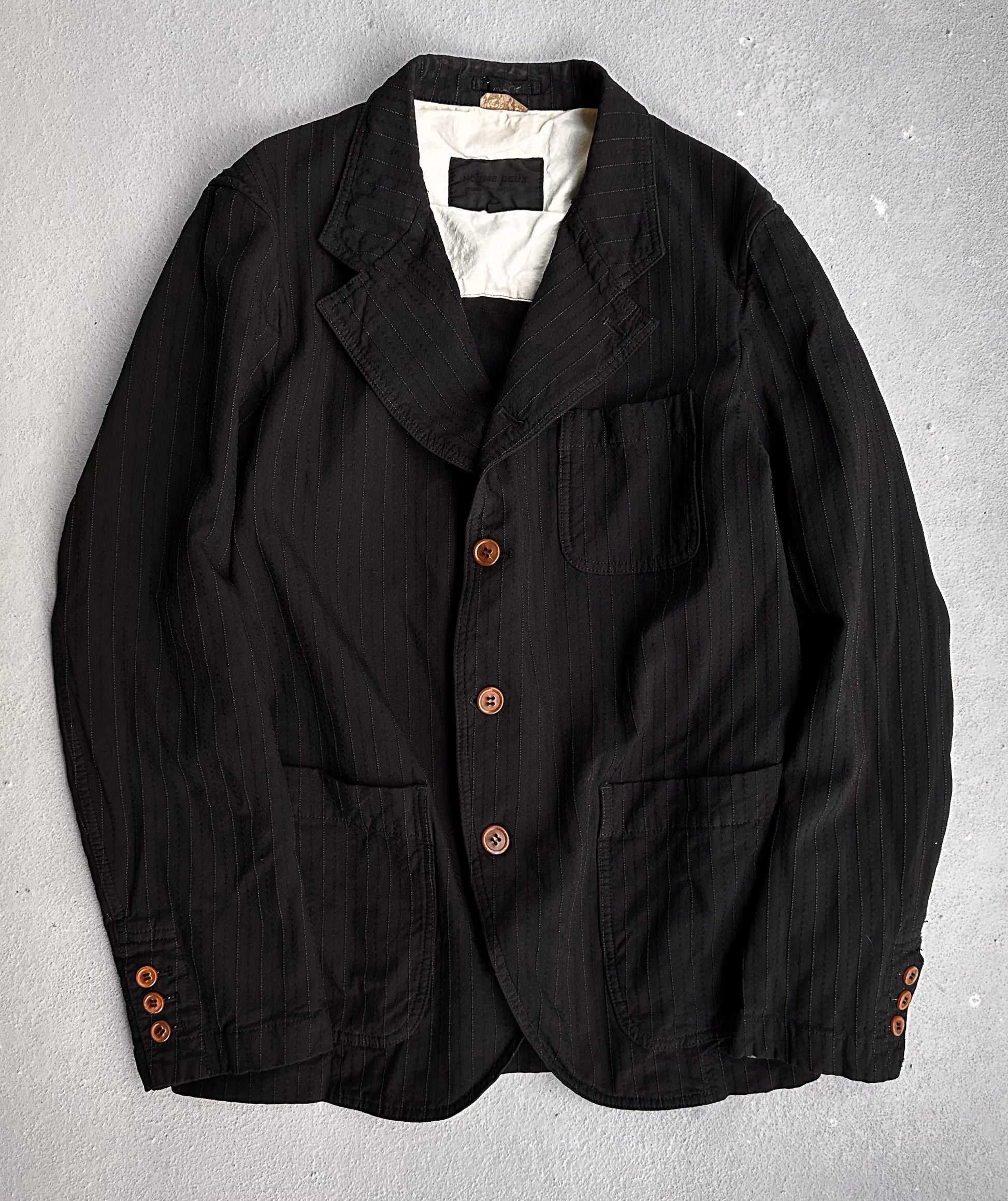 Spearheaded by the visionary Rei Kawakubo, COMME des GARÇONS epitomizes avant-garde fashion with its revolutionary aesthetic and design ethos. Since its inception in Tokyo in 1969, the brand has disrupted conventional norms, embracing asymmetry, deconstruction, and unconventional silhouettes. Kawakubo’s fearless approach to fashion blurs the lines between art and clothing, creating thought-provoking collections that challenge perceptions. This particular blazer from COMME des GARÇONS diffusion line, HOMME DEUX, effortlessly blends sophistication with a modern edge. It features a sleek black silhouette that serves as a versatile backdrop for a variety of outfits. The blazer is accented with several distinctive brown buttons, which add a warm contrast and a touch of character to the design.