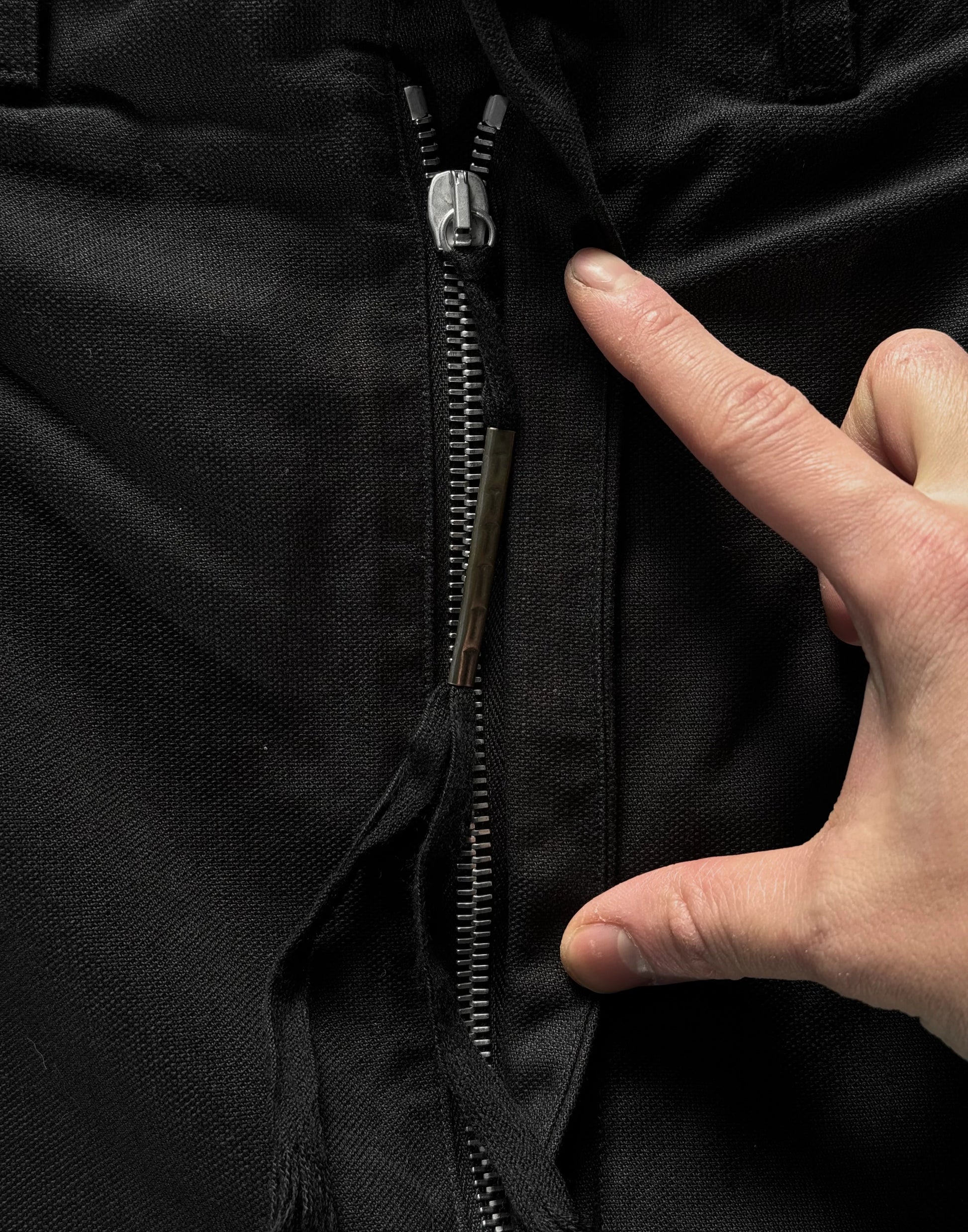 Loose inner waistband button, washed out care tags, hardware oxidation on the fabric around the fly & hook closure, light wear throughout.