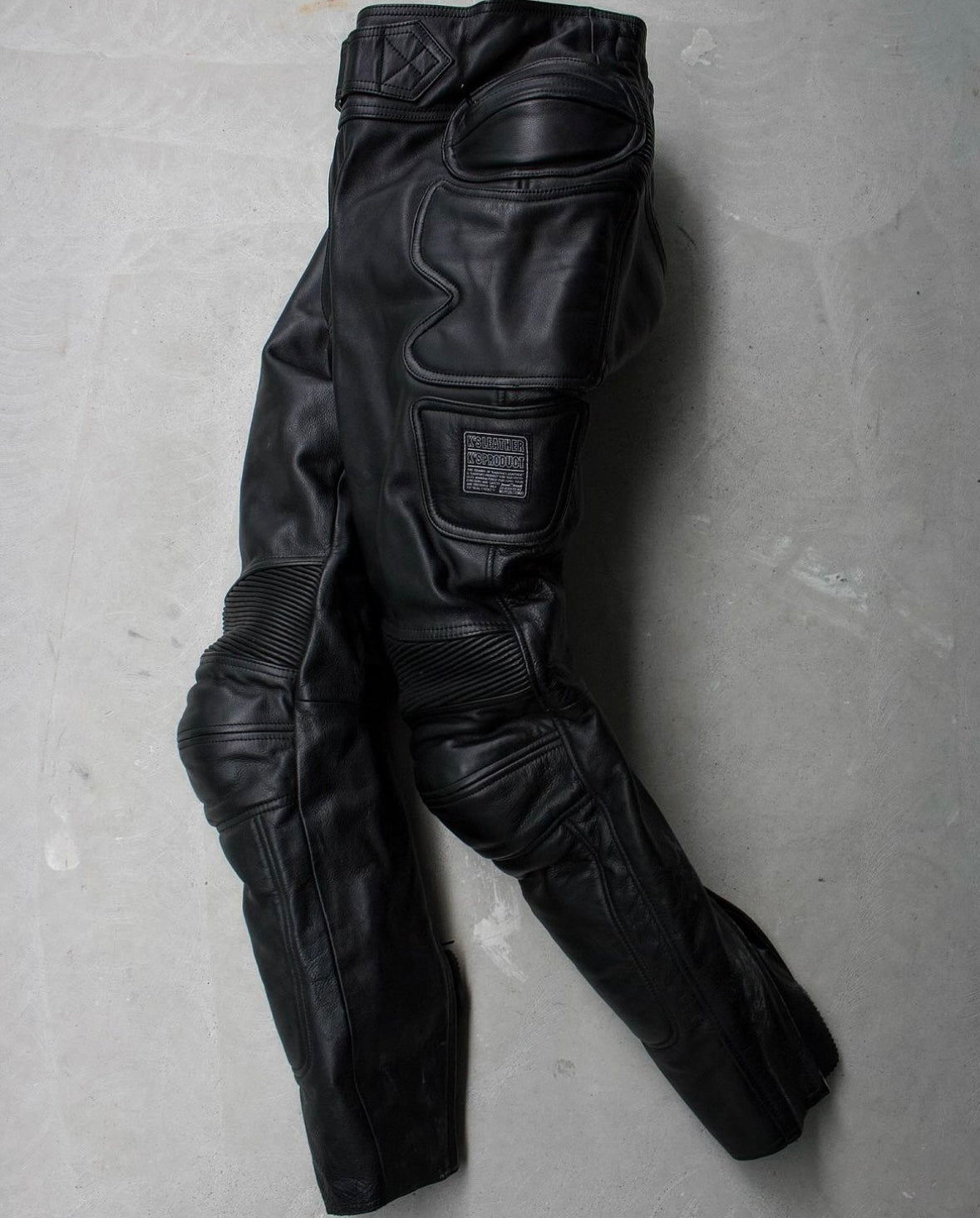 Founded since 1935, Kadoya is a manufacturer with heritage of motorcycle safety gears based in Tokyo, Japan. The company is notorious for “nurturing” the craft for leather specialty goods catering to bikers or motorcycles enthusiast. “Each craftsman sews one piece of clothing” that has continued without change is their proud philosophy that plays a part in Japanese manufacturing. The origin of their head factory is based on the idea of craftsmanship with enthusiastic attitudes”, cultivated by Kadoya artist, and the feelings of all those who love leather jackets and motorcycles. Additionally, they continue to create different garments and silhouette that can be worn for the daily throughout generations with a timeless manners. The particular pants has so much intricate details. Constructed from high quality cowhide leather with lined interior, features thick paddings throughout the hips and knee area for safety during motorcycle usage.