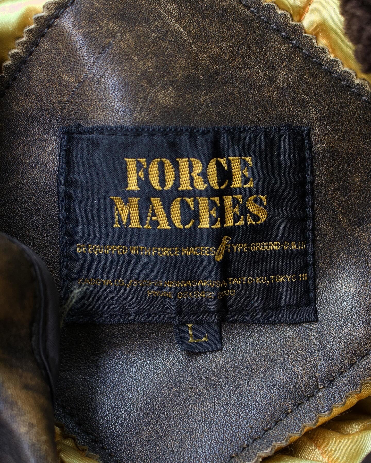 Founded in 1935 in the renowned leather town of Asakusa, Kadoya started as a maker of leather suits and jumpers supplying Japanese soldiers at the beginning throughout til’ end of WorldWar II. Known for their deep understanding of leather’s true character, Kadoya was entrusted by the Metropolitan Police Board to produce leather coats for many years. This expertise led Kadoya to become a premier leatherware manufacturer for motorcycle riders. Both amateur and professional riders trust Kadoya’s products for their quality and reliability. The company’s president, an avid rider, is dedicated to creating leatherware that is not only functional but also thrilling to wear. “FORCE MACEÉS” was established as a sub-label under Kadoya Head Factory in the early 1990’s to produce premium military-inspired leatherwear products. The particular leather jacket was based on a classic MA-1 Aviator style bomber jacket, crafted from the highest grade of full grain cow leather that has been naturally faded due to 20+ years of wear, come fitted with a removable quilted inner lining and fur collar.