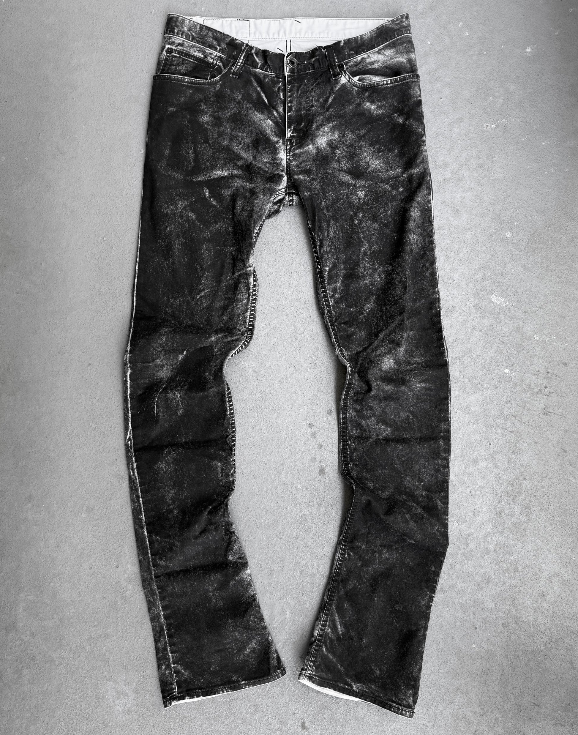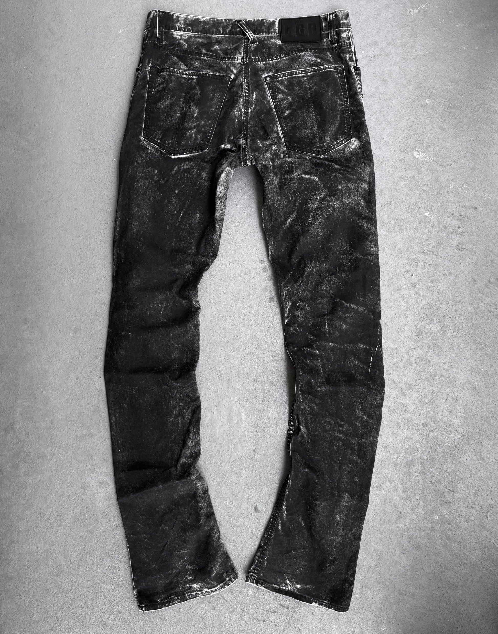 These denim jeans are treated with a unique acid wash that creates a cloudy mottled appearance. They are lightly waxed adding refined visual depth and subtle texture. The long inseam length will create a "stacking" effect on the legs, adding even more character that will further develop with wear.