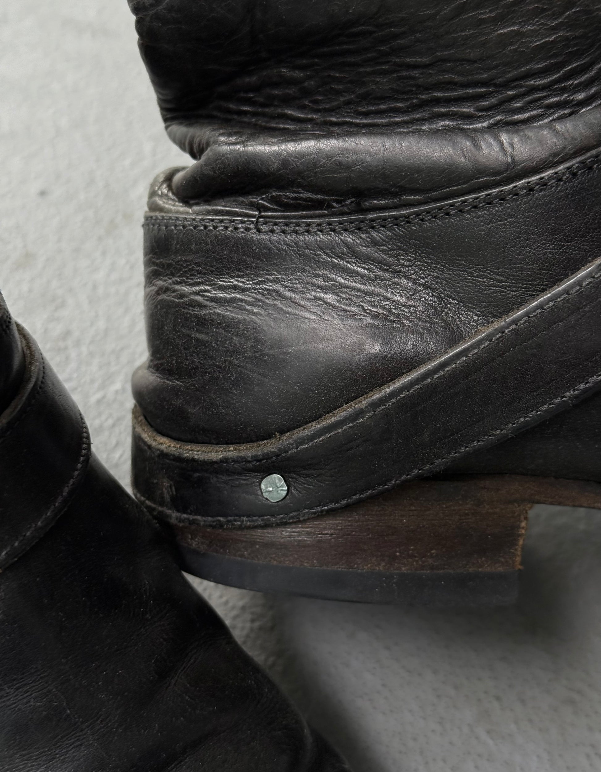 Hole at the back of the right boot heel area, scuffs, scratches, & hairline cracks on the toe box, wear at the outsoles and leather upper, unravelled threads on both boots, Vibram rubber half sole & heel installed