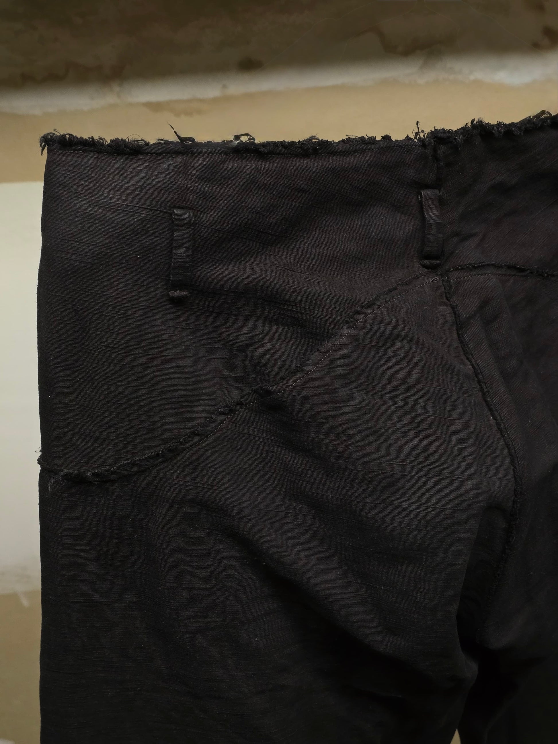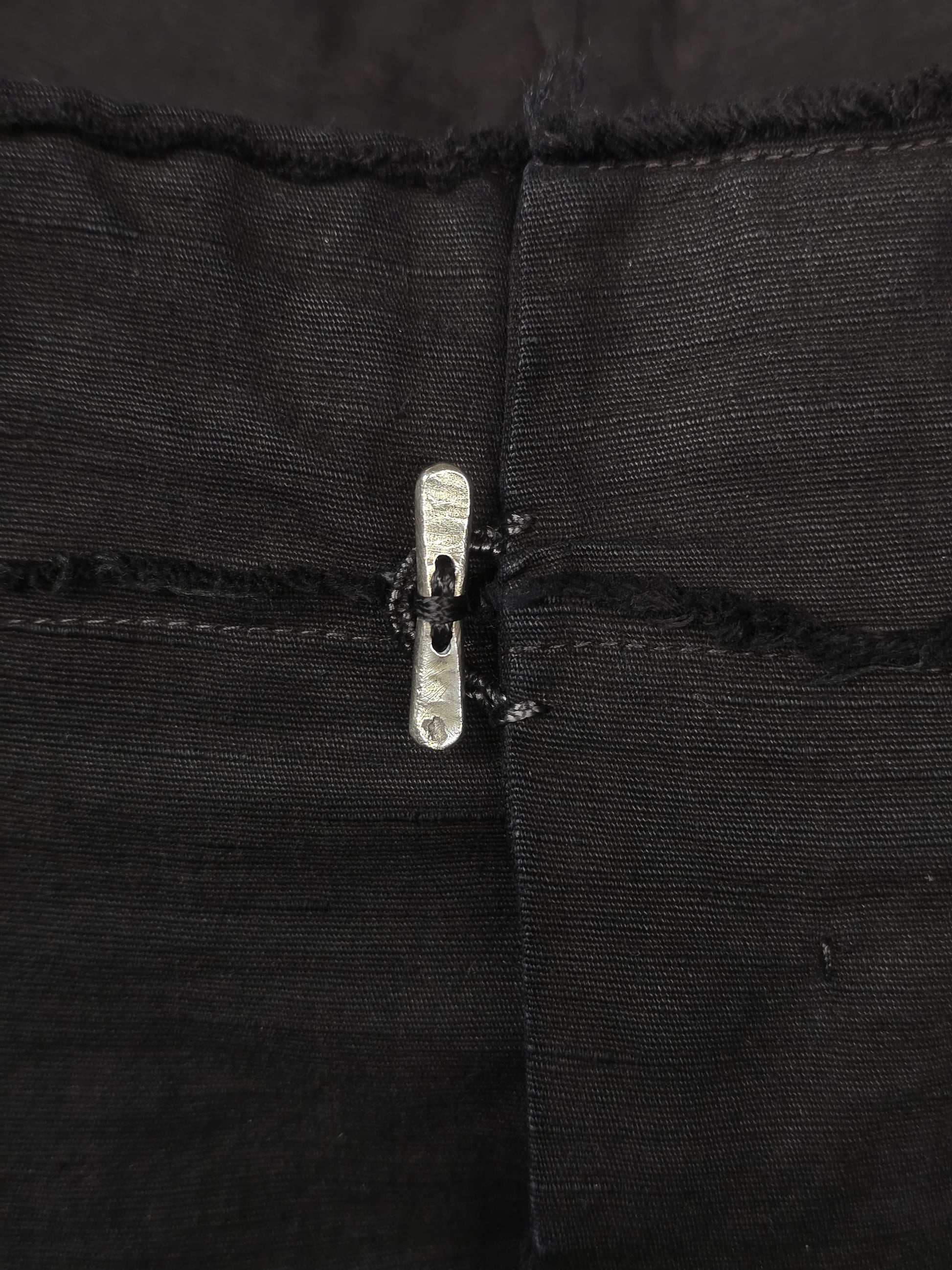 Small dark stain at the left & right thigh area, minor fabric tear by the bottom of the crotch seam, fabric irregularities & light wear throughout