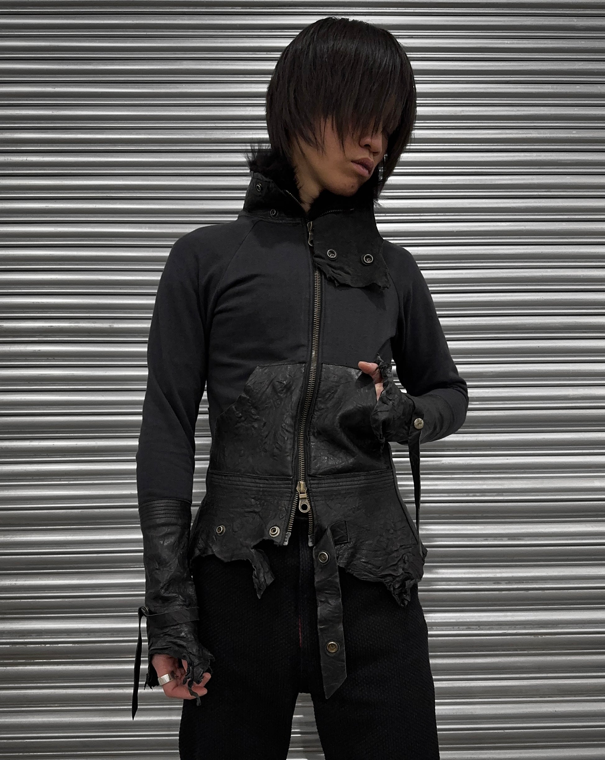 Michel Berandi is a Paris-born fashion designer renowned for his avant-garde approach, blending luxury with conceptual edge. Initially a partner at Cosa Nostra, he launched his eponymous label in October 2005, offering men’s and women’s collections that fuse rock ‘n’ roll aesthetics with high-end couture. His Autumn/Winter 2006 collection marked a significant evolution in his design philosophy, emphasizing a more focused and cohesive aesthetic. Departing from his earlier experimental approach, Berandi utilized high-quality Italian fabrics and minimized embellishments to create refined silhouettes. The collection drew inspiration from skeletal and insect forms, resulting in garments with distressed textures and asymmetrical hems that mirrored natural decay.
