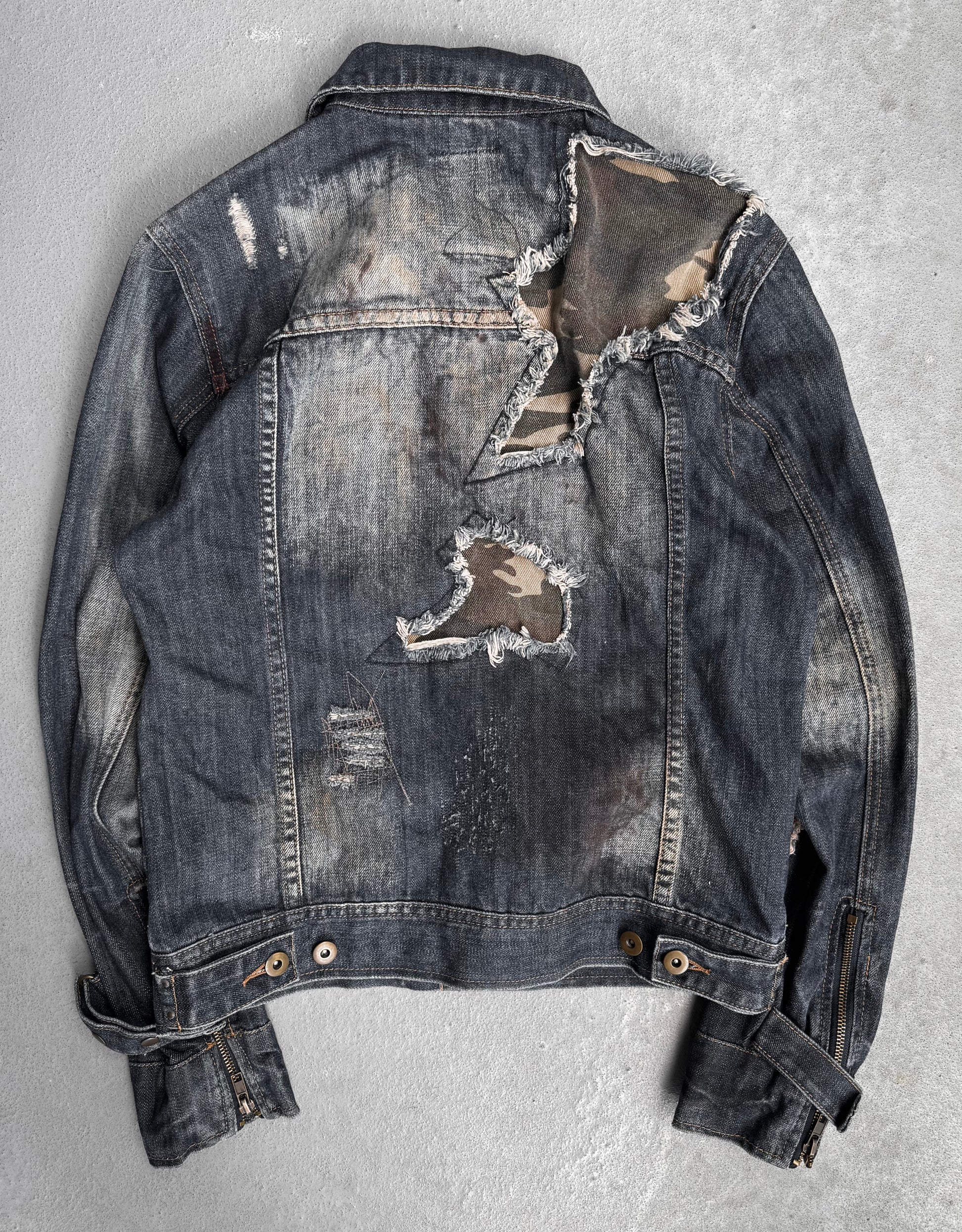 Midas Early 00s Mud-stained Camo Patchwork Denim Trucker Jacket