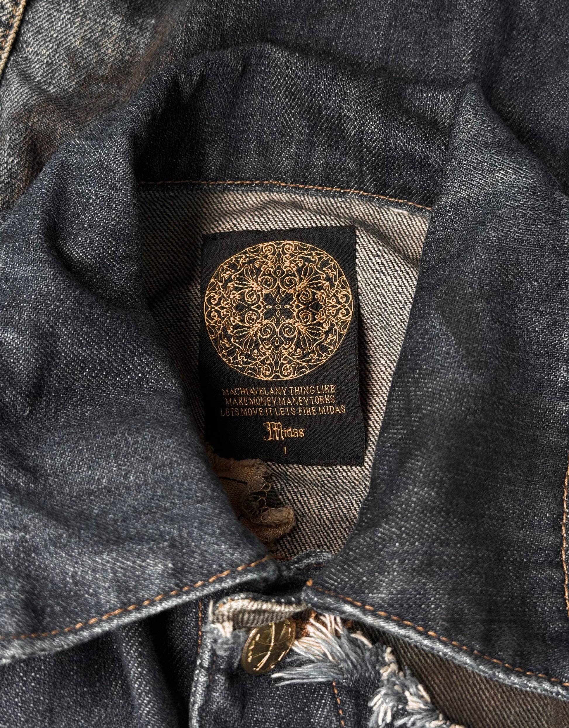 Midas is a niche Japanese fashion brand that emerged in the early 2000s, known for its bold blend of gothic, punk, and glam aesthetics. The brand gained a cult following in Japan’s underground and visual kei scenes (a Japanese subculture and music movement) due to its theatrical flair, metallic embellishments, and edgy silhouettes. This 100% cotton denim jacket features front zip pockets, camo patchwork details, intentional distressing throughout, and sleeves with adjustable straps and zippers.