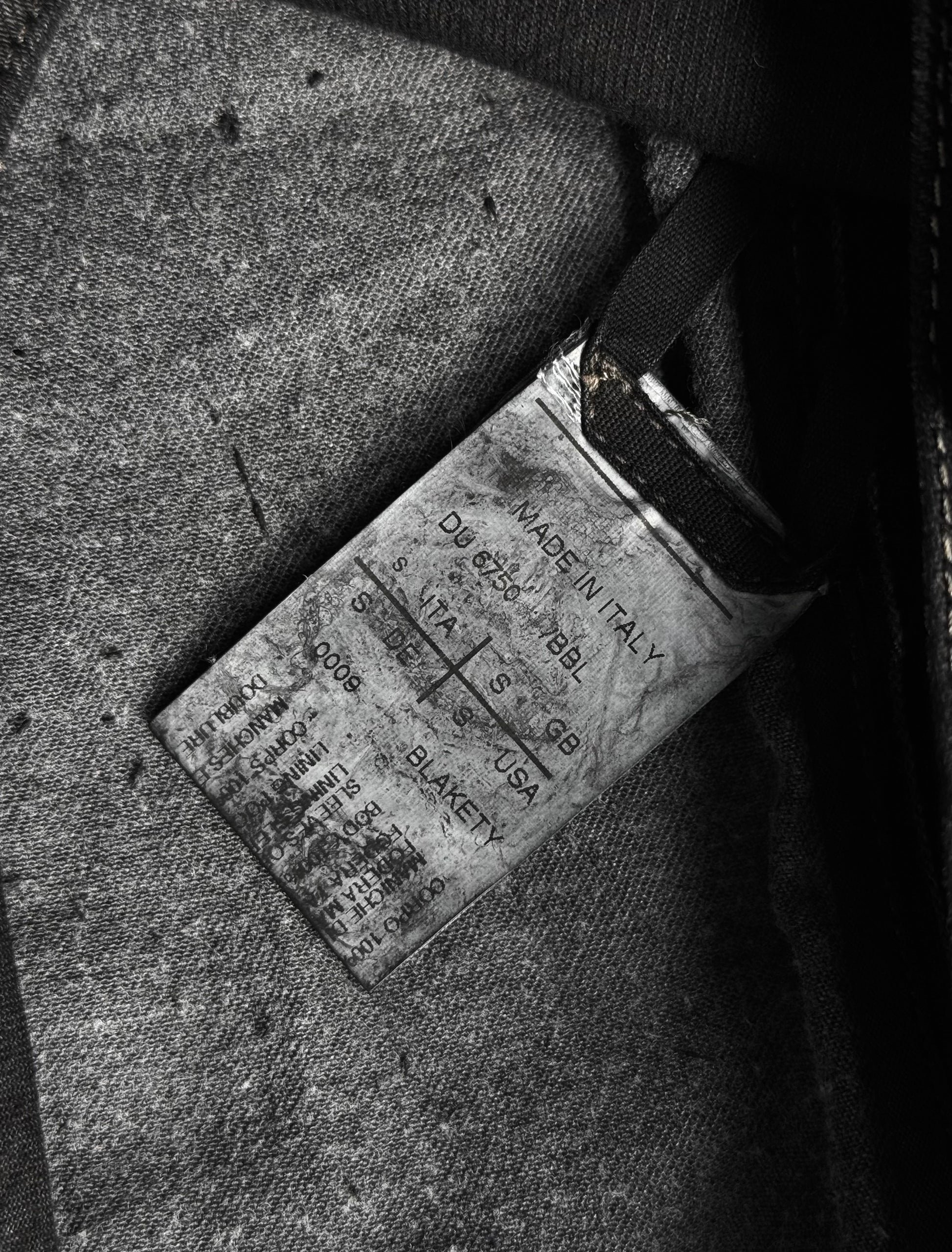 This worker jacket features two front & interior pockets, the classic 'slave' asymmetrical collar, and a hidden button placket. Constructed with a waxed cotton denim body and complemented by black calfskin leather sleeves, this jacket achieves a refined yet assertive silhouette.