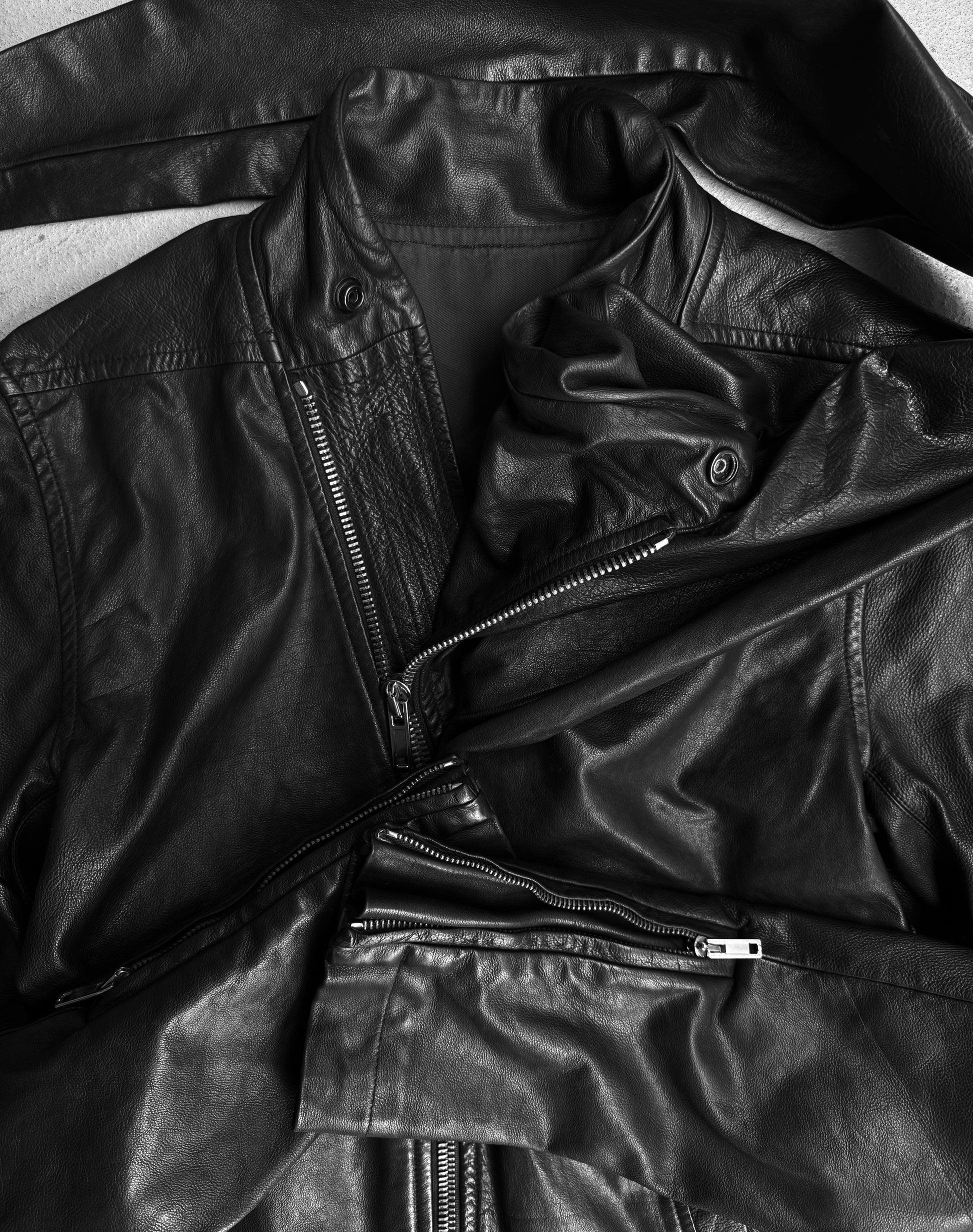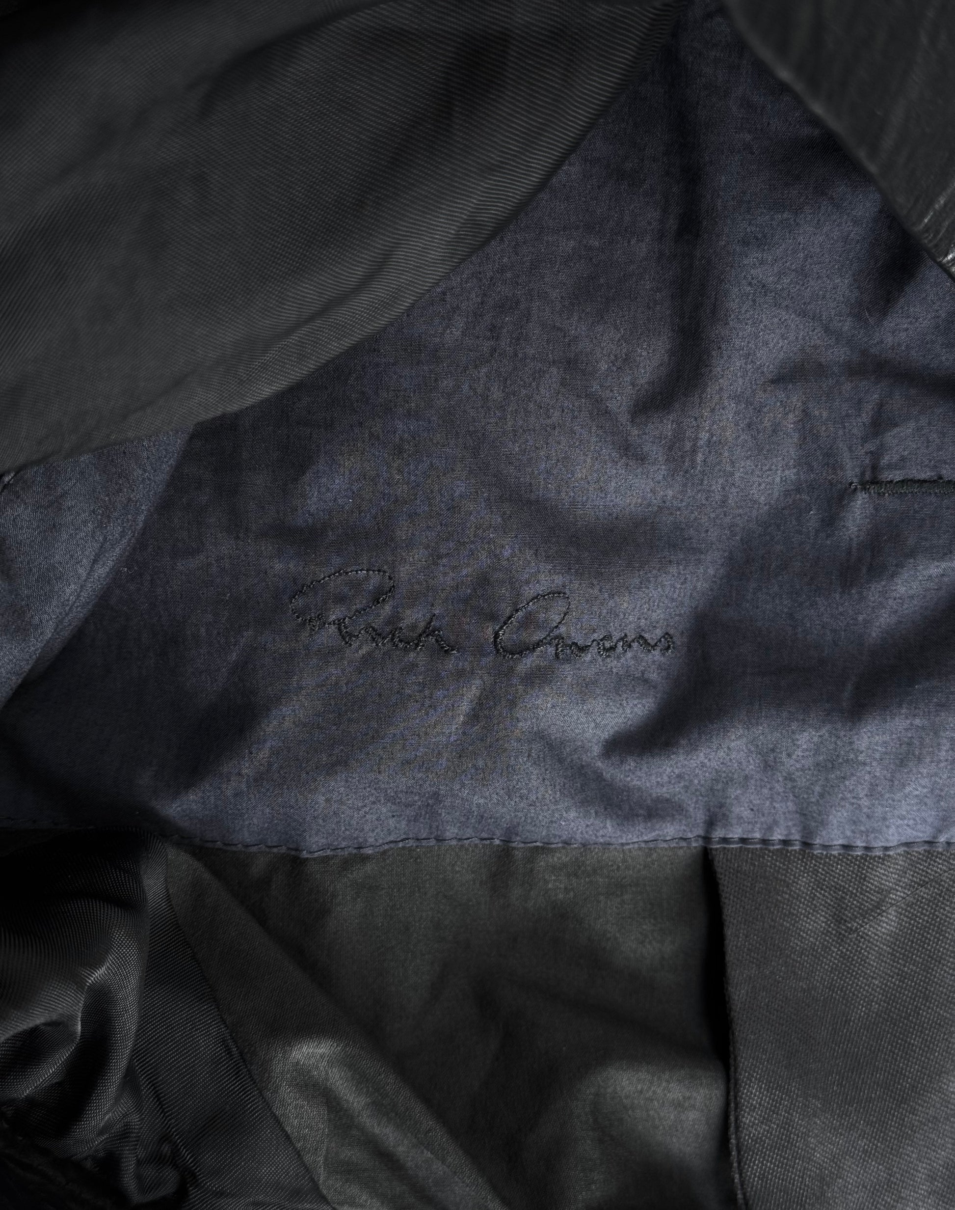 Spring/Summer 2011 “ANTHEM” collection was a visceral tribute to asceticism and raw elegance—featuring elongated silhouettes, militant layering, and a stripped-back palette of black, bone, and dust. Referencing spiritual purity and brutalism, “ANTHEM” pushed Owens’ vision of futurist monasticism through a gothic lens. Featured here is a calfskin leather jacket from the collection, showcasing a signature wrap-over collar, subtle waist tapering, and Owens’ hallmark elongated sleeves.