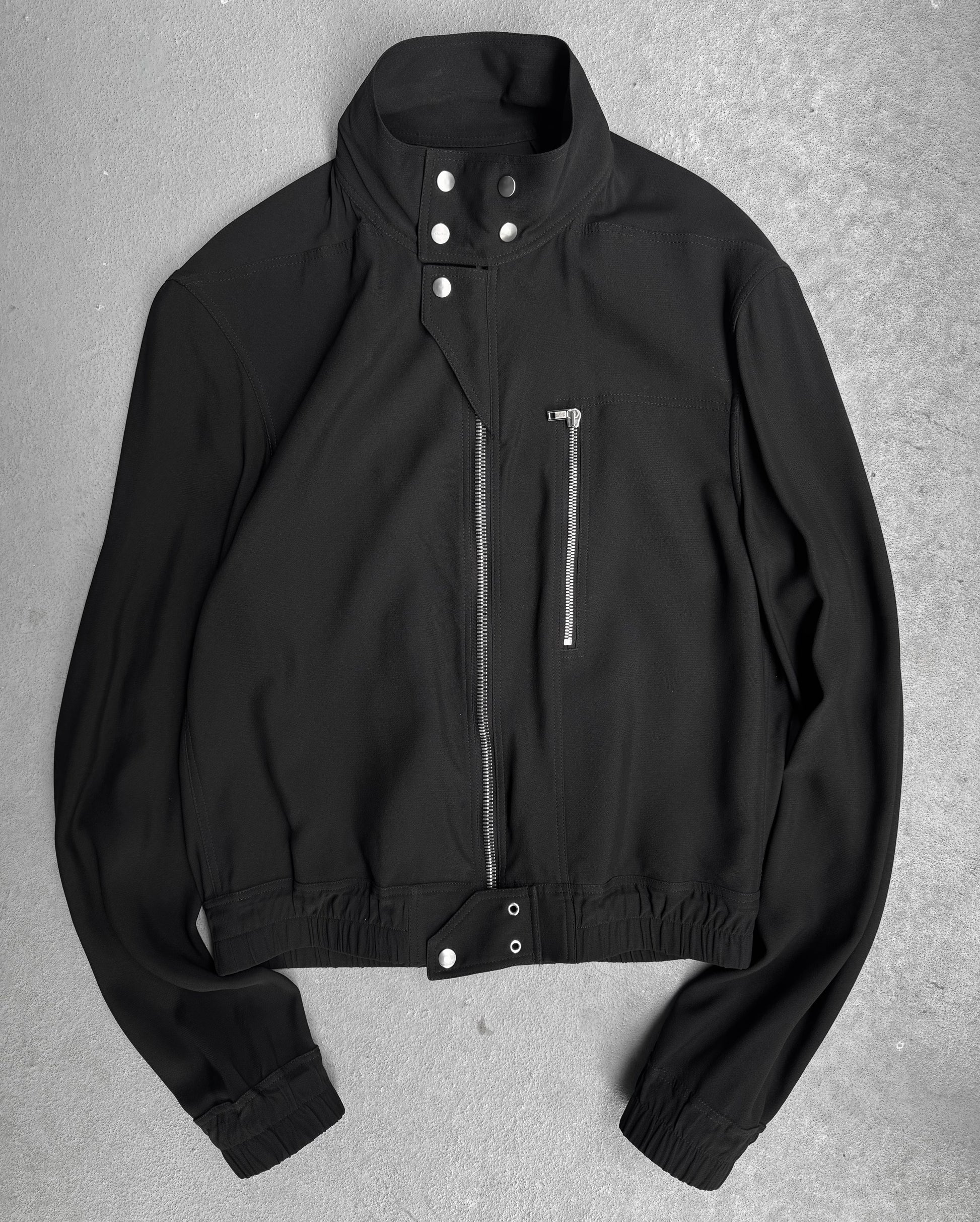 This bomber jacket, crafted from a lightweight viscose blend, showcases a cropped silhouette, high neckline, extended sleeves, and includes two spacious inner pockets plus one chest pocket, reflecting Rick Owens' distinctive aesthetic.