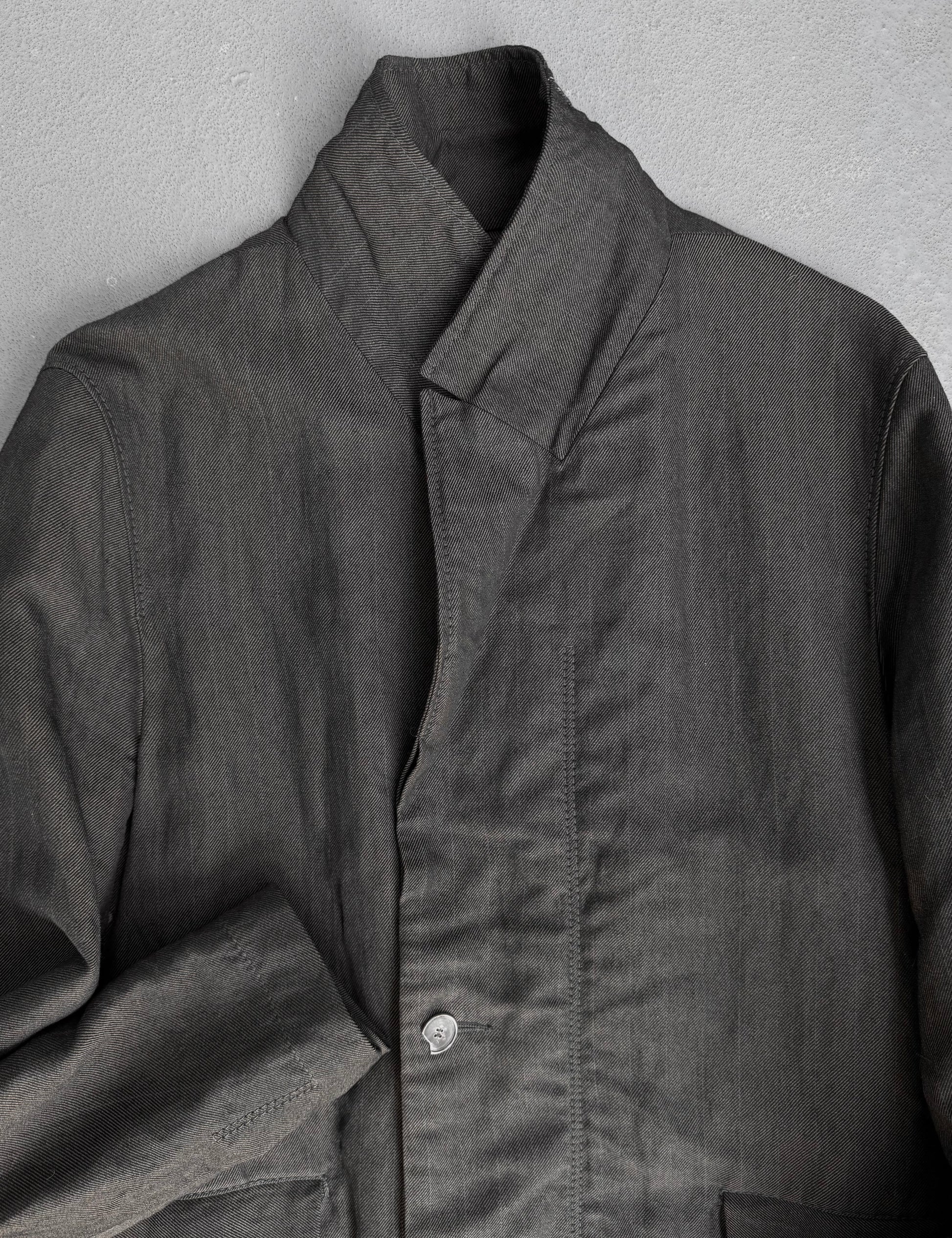 This is the brand's classic double-breasted jacket. The original pattern is expertly designed to minimize seam intersections, providing a distinctive fit along with enhanced comfort. The front includes three buttons, with only the middle one visible when secured. The collar can be styled either up or down. Three-dimensional flap pockets are positioned on the sides, and all metal fittings and buttons are crafted from .925 silver.