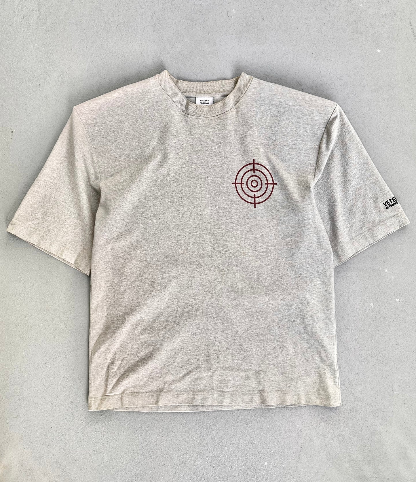 VETEMENTS (“Vet-MAW”), founded by Georgian brothers Demna and Guram Gvasalia in 2014, quickly disrupted the fashion scene with its avant-garde designs and streetwear aesthetics. Known for its absurd silhouettes and unconventional approach, the label pushed the boundaries of modern fashion norms despite controversies over high prices and fast fashion influence. From VETEMENTS Fall 2017 collection, this t-shirt is a standout piece that features a striking red target emblazoned on the right chest, creating a bold focal point. On the back, it showcases the Eleven Inch Gun Club logo, referencing the Los Angeles Gun Club emblem. The t-shirt is designed with shoulder pads for an elevated silhouette, adding a unique twist to the contemporary streetwear aesthetic.